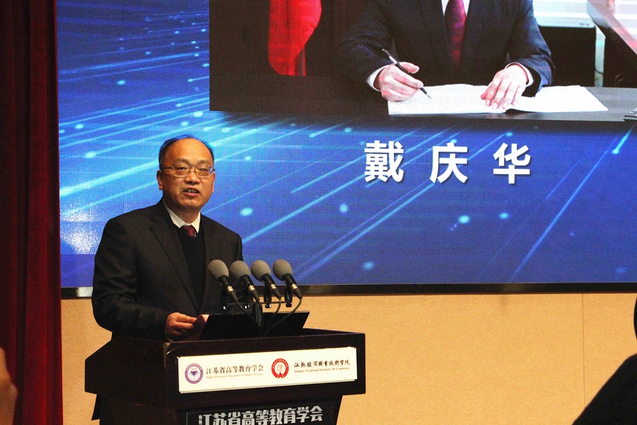 江苏经贸职业技术学院党委书记戴庆华教授代表学校,对莅临会议的领导嘉宾、专家同仁表示热烈欢迎,简要介绍学校的办学历程,学校坚守育人初心,紧贴区域发展需求,学校坚持立德树人根本任务,坚持产教融合发展主线。最后,戴庆华书记表示将竭诚做好服务保障,希望与会领导专家一如既往地关心、支持学校教育改革事业的发展。